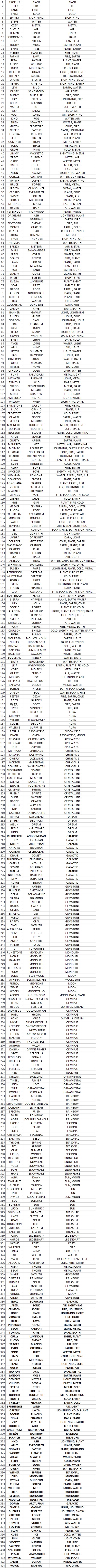 I screen-shotted the list of all the dragons I have. There's 404 counting the twins. It's a big picture and you may have to zoom in to see everyone: here. If the dragon is bold, they're a twin. The columns go Name, Type, Elements.