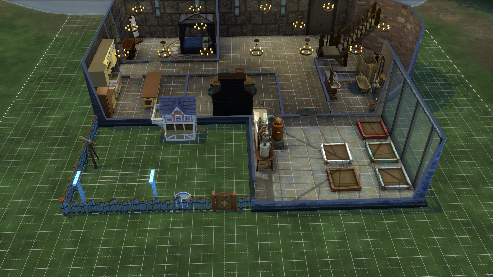 Image of a Sims 4 House showing off the front and side tower, which has a glass roof showing bookcases Image of a Sims 4 House showing off the back wall, greenhouse, and back garden area Image of a Sims 4 house done in stone and brick, showing off greenhouse and back garden Image of a Sims 4 house done in stone and brick, showing off rooms from the side Image of a Sims 4 house done in stone and brick, showing off rooms from the front
