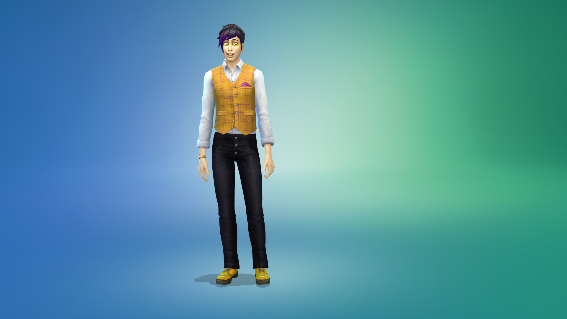 My Sim Smiler in a white shirt, yellow checked vest, black pants, and yellow shoes