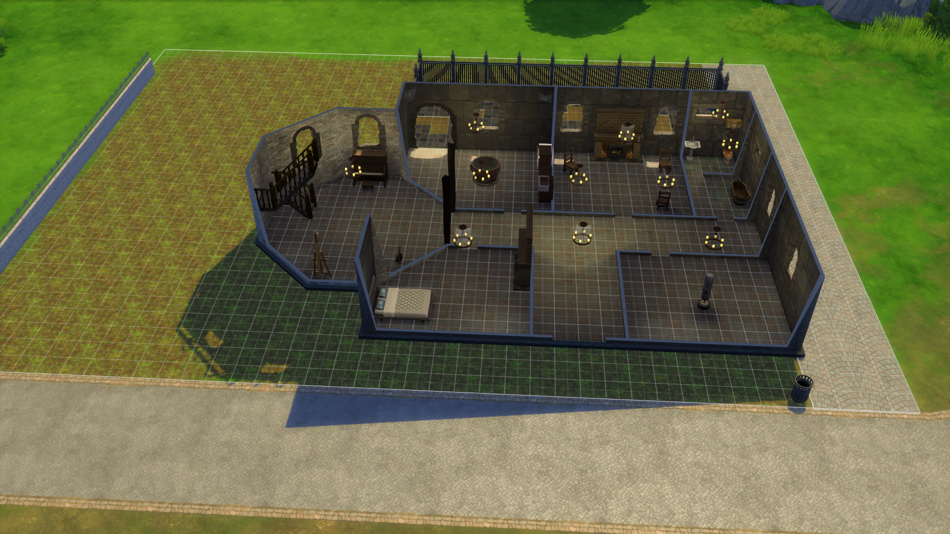 A) Putz around a little bit with my Gutknecht Bend VITD build! This is the version of my Gutknecht Bend build which is trashed and falling apart, as per its appearance in my “Valicer In The Dark AU.” Today’s goal was to make it look even more rundown and make it a little cheaper so, if I ever do do my VITD-themed challenge save, it MIGHT be affordable for my Valicer trio without me having to cheat. To that end, I deleted the dining table in the dining room (and scattered the chairs about, as per the description of the room in my actual “Home Sweet Lair” fic scene) and the selling table outside; painted the yard with the “Scratchy In Patches” terrain paint to suggest a lawn that had mostly died off; widened the fake “road” on the side of the lot by a tile so it was flush with the actual lot boundary; moved the debug walls and post-box thing over to the edge of the lot on the other side (as I decided I wanted that “yard space” to work with); took a few chunks out of the back patio with the sledgehammer tool (and then painted in the gaps with dirt); made the sewer basement area a little bit smaller (as that sewer pool is probably the most expensive bit of the lot); and added some more cracks and cobwebs around the shop. Here are some representative pictures showing what the downstairs is looking like now (as I didn’t do pretty much anything with the tower bit) –