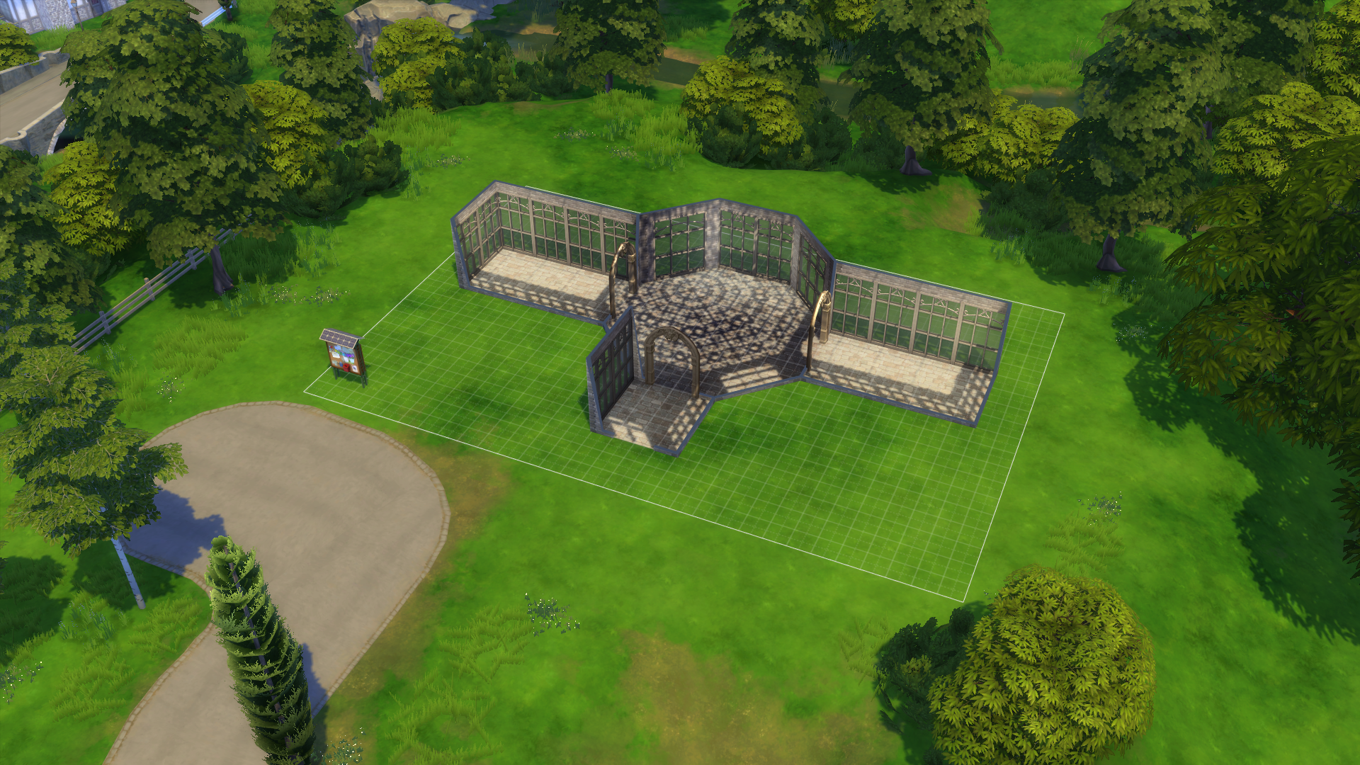 C) So yes, with the original house demolished, and the new lot type set, I started on my conservatory! And actually, getting it to come together was pretty easy, as I already knew what I wanted it to look like – an octagonal “dome” in the center, with two long rooms coming off either side and a small “entrance hall” in the front. I built that without much issue (just had to make the octagon a little bigger so the side rooms would be big enough), put on the roofs (a big dome over the center octagon, a long hipped roof cutting through the center of the main dome to cover both side wings at once, and a small curved roof for the front), and started changing all the roof patterns to glass –