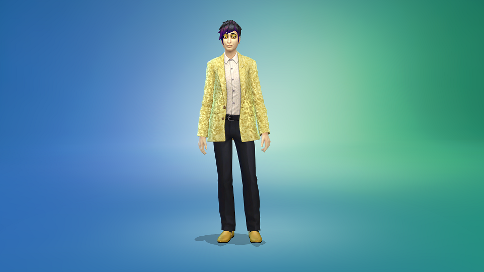 Next, we have another formal look that, as you might imagine, was at least partially inspired by me seeing that sparkly yellow jacket and going “Felix E. Lated Vibes!” XD But yes, Smiler here is sporting a sparkly yellow jacket and off-white shirt combo from High School Years; a pair of black base game pants with a belt (I have decided I like Smiler in belts); a pair of yellow shoes from Luxury Party Stuff (maybe not QUITE the right shade of yellow but it felt them); and some dramatic yellow Get To Work eye makeup paired with some winged black Luxury Party Stuff eyeliner. I liked the combo and felt it suited the look!