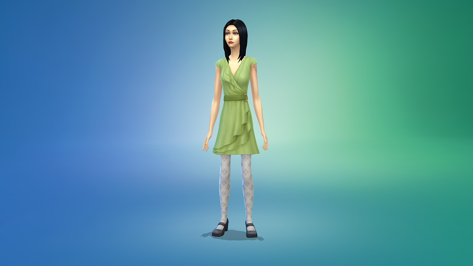 As for shorter dresses, I tried this wrap-around ruffly one out on Alice and decided I liked the look of it – no good blue swatches, though, so she’s in green instead. Hey, it’s fine to mix up the colors sometimes! This one is paired with those nice high diamond-patterned socks from Crystal Creations (still love the clothes from that pack), plus a pair of gray strap shoes. Though maybe I should have gone for pure black...or gold, to match the belt buckle on her belt. *shrug* Eh, it looks good enough!